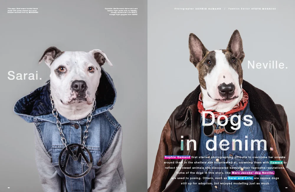 My editorial for LOVE Magazine! Featuring celebrity dogs like Neville (Marc Jacobs') and his best buddy Charlie, and some of my favorite, gorgeous models (Harvey, Henry, Lucy and Konta) and including 2 adoptable pit bulls who are still waiting for a forever home (and who were also flowered for my Flower Power project): Lola and Sarai are available through Rebound Hounds. Fashion Editor: Steve Morriss