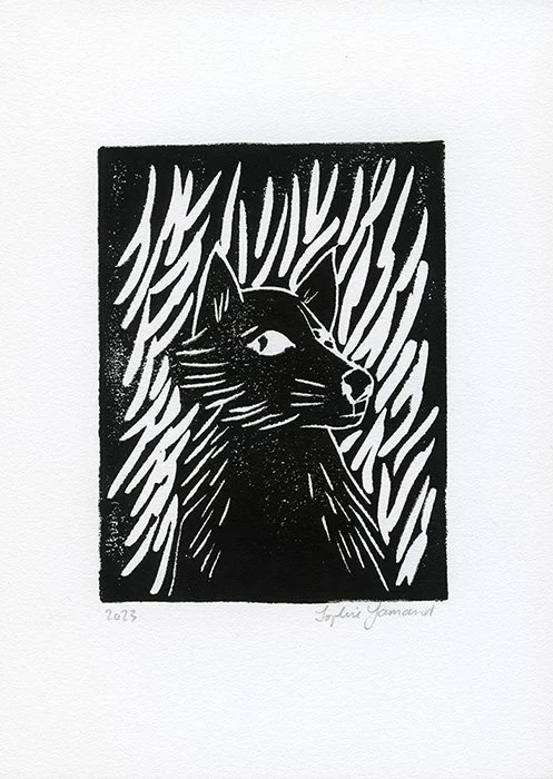 Original block prints. I carved the image in a block, applied ink to the block and printed each by hand. For that reason, each is unique. Flaws and mishaps are a part of this process.
