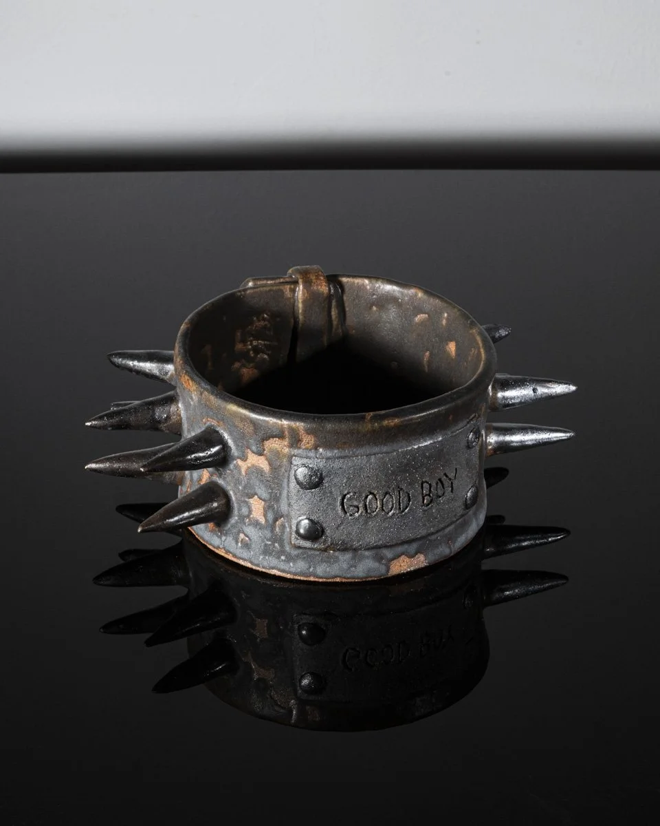 Enshrined in ceramic and photographed like museum artifacts, these collars are the relics of the rituals we perform, where the line between love and violence is often blurred, and tenderness can be confused with domination. Some pieces bear names carved into plaques: Cuddles, Best Friend, or Good Boy. These words of intimacy contrast with the padlocks and spikes, exposing the uneasy proximity between care and control.
